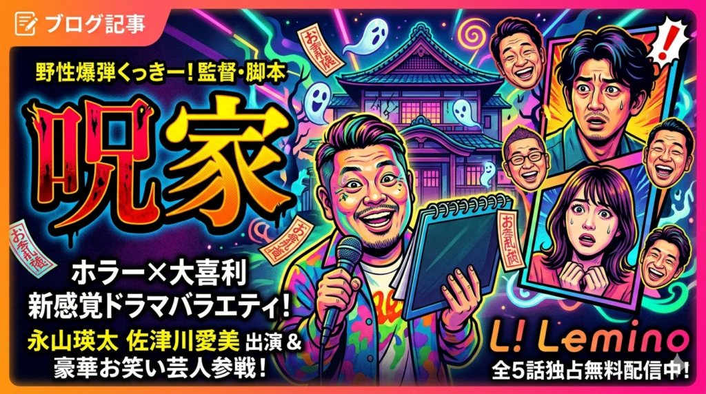 野性爆弾くっきー!が監督・脚本を手がけたドラマバラエティ「呪家(ノロイエ)」は、Leminoで全5話を独占無料配信中です。永山瑛太と佐津川愛美が出演するホラードラマと、豪華お笑い芸人による大喜利が融合した新感覚作品を、今すぐ楽しめます。 結論:...