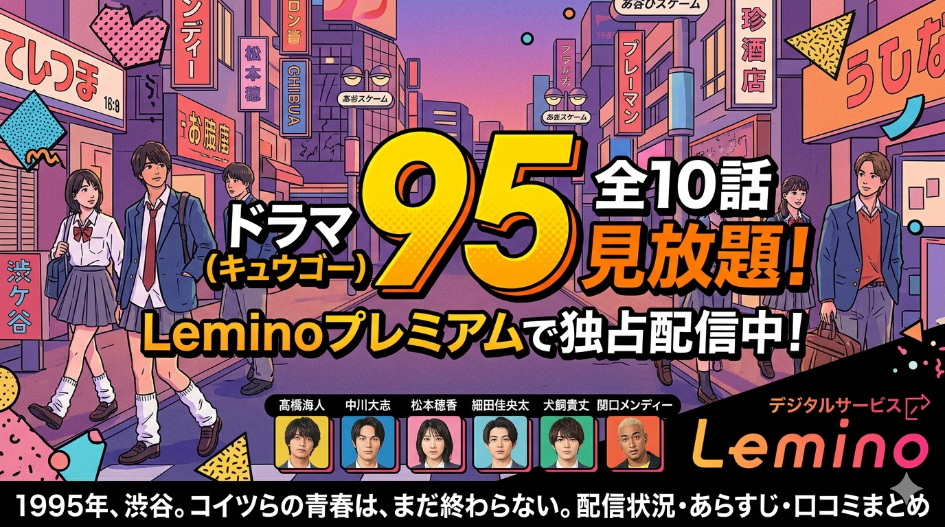 テレビ東京開局60周年記念ドラマ「95(キュウゴー)」は、Leminoプレミアムで全10話が見放題配信中です。髙橋海人、中川大志、松本穂香ら豪華キャストが集結し、1995年の渋谷を舞台に高校生たちの熱い青春群像劇を描いた本作の配信情報・あらすじ・口コミを詳しくまとめました。