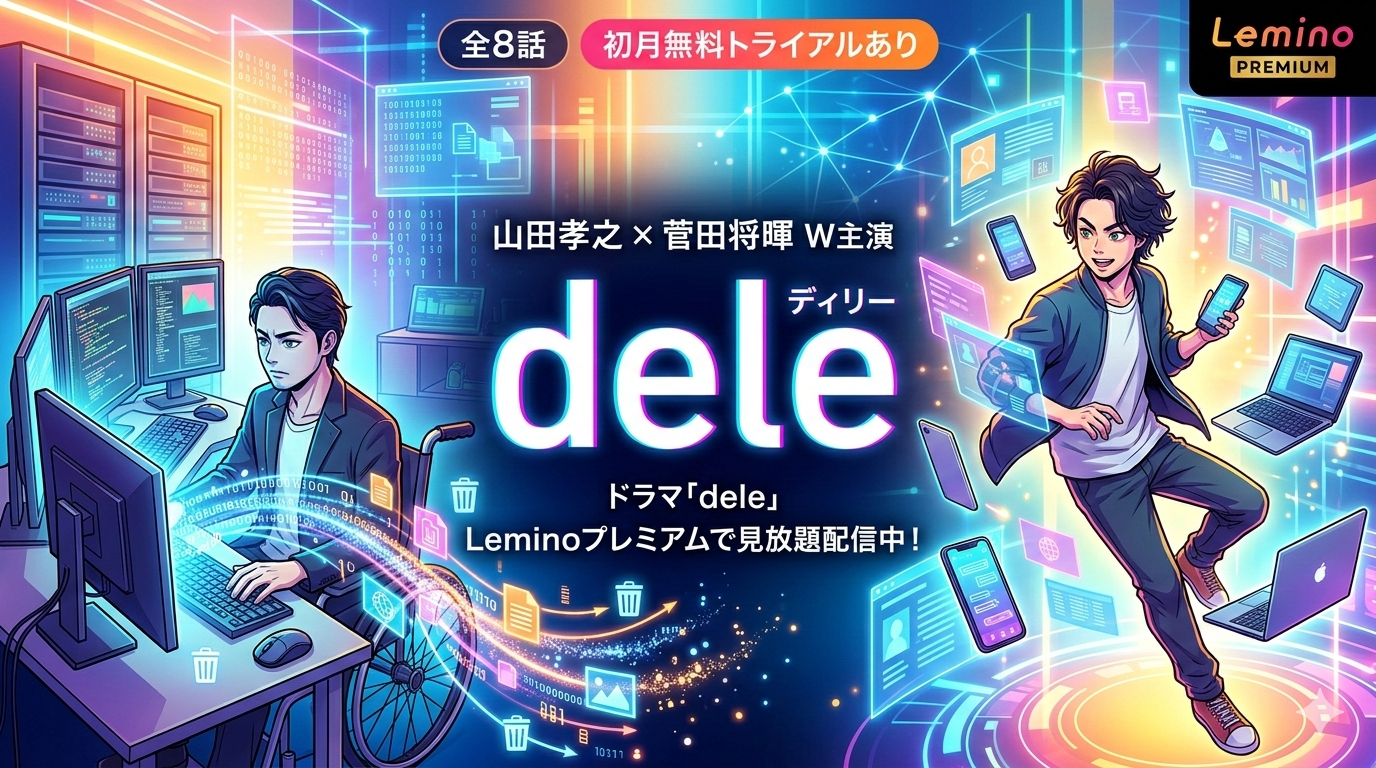 ドラマ「dele(ディーリー)」は、2026年2月現在Leminoプレミアムで全8話が見放題配信中です。山田孝之×菅田将暉のW主演で話題を集めた本作は、「デジタル遺品の削除」という斬新なテーマを扱ったヒューマンミステリーの傑作。初月無料のLeminoプレミアムなら、全話を一気に楽しめます。