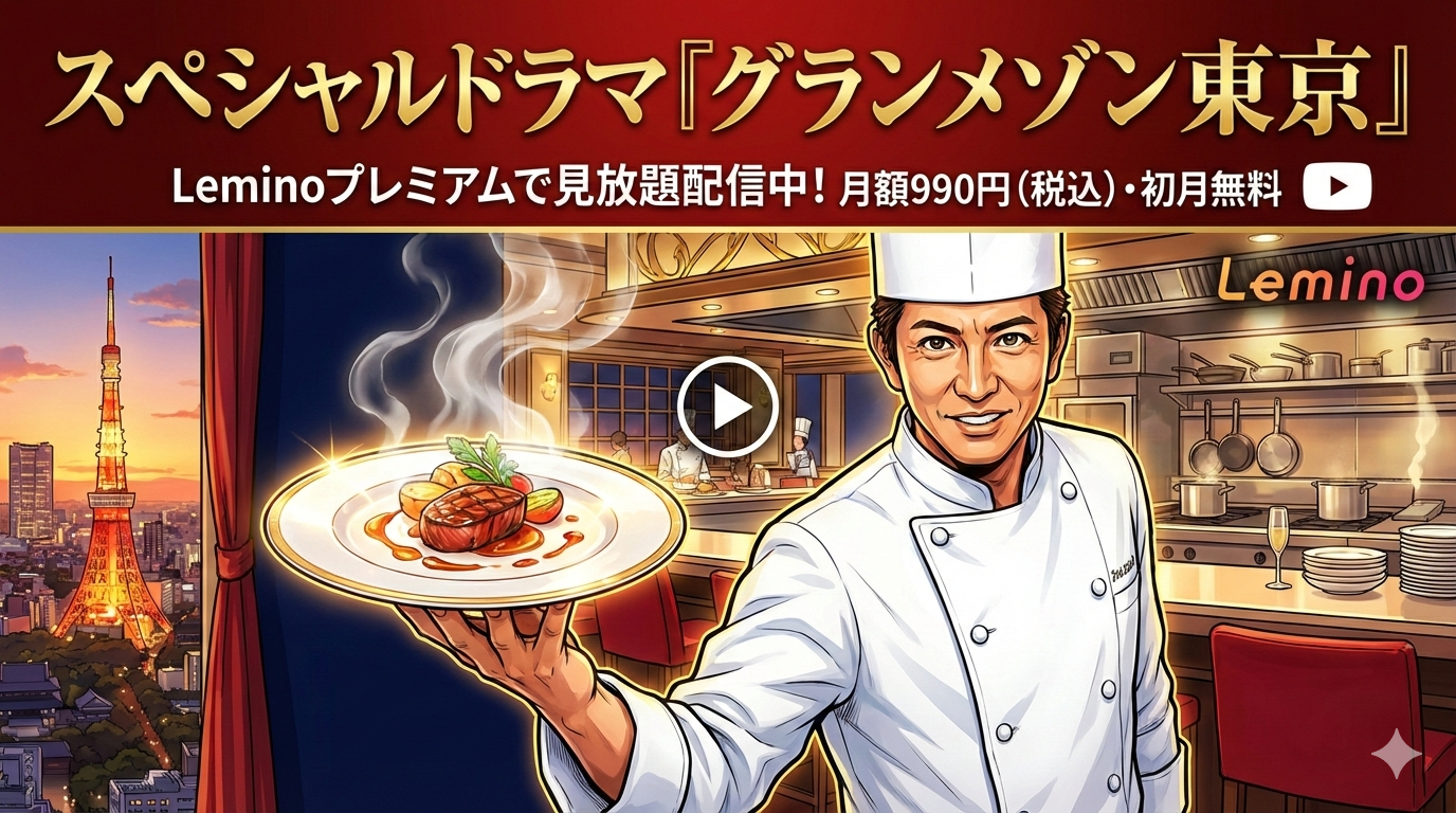 スペシャルドラマ『グランメゾン東京』は、Leminoプレミアムで見放題配信中です。木村拓哉主演の大人気グルメドラマの特別編を、月額990円(税込)・初月無料で今すぐ視聴できます。本記事では2026年2月最新の配信状況、あらすじ、見どころ、口コミ・評判をまとめました。