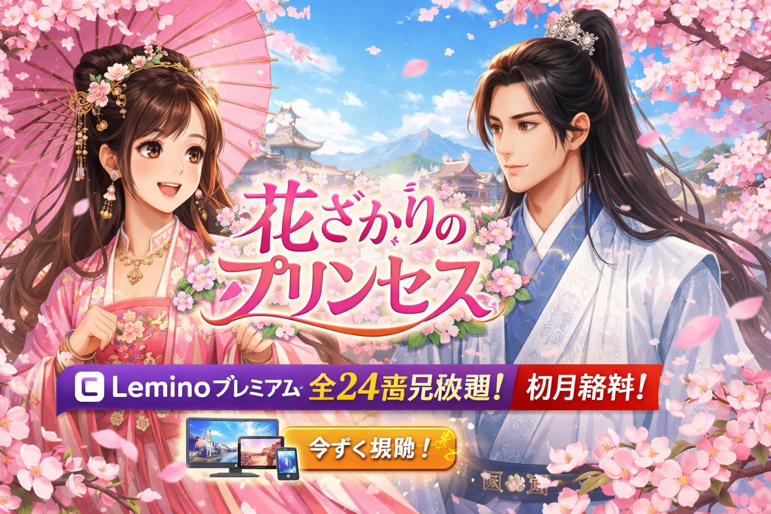 中国ドラマ「花ざかりのプリンセス」は、2026年2月現在Leminoプレミアムで全24話が見放題配信されています。月額990円(税込)で初月無料のため、まだ登録していない方はお試しで全話イッキ見も可能です。本記事では配信状況・あらすじ・キャスト・見どころ・口コミを徹底的にまとめました。
