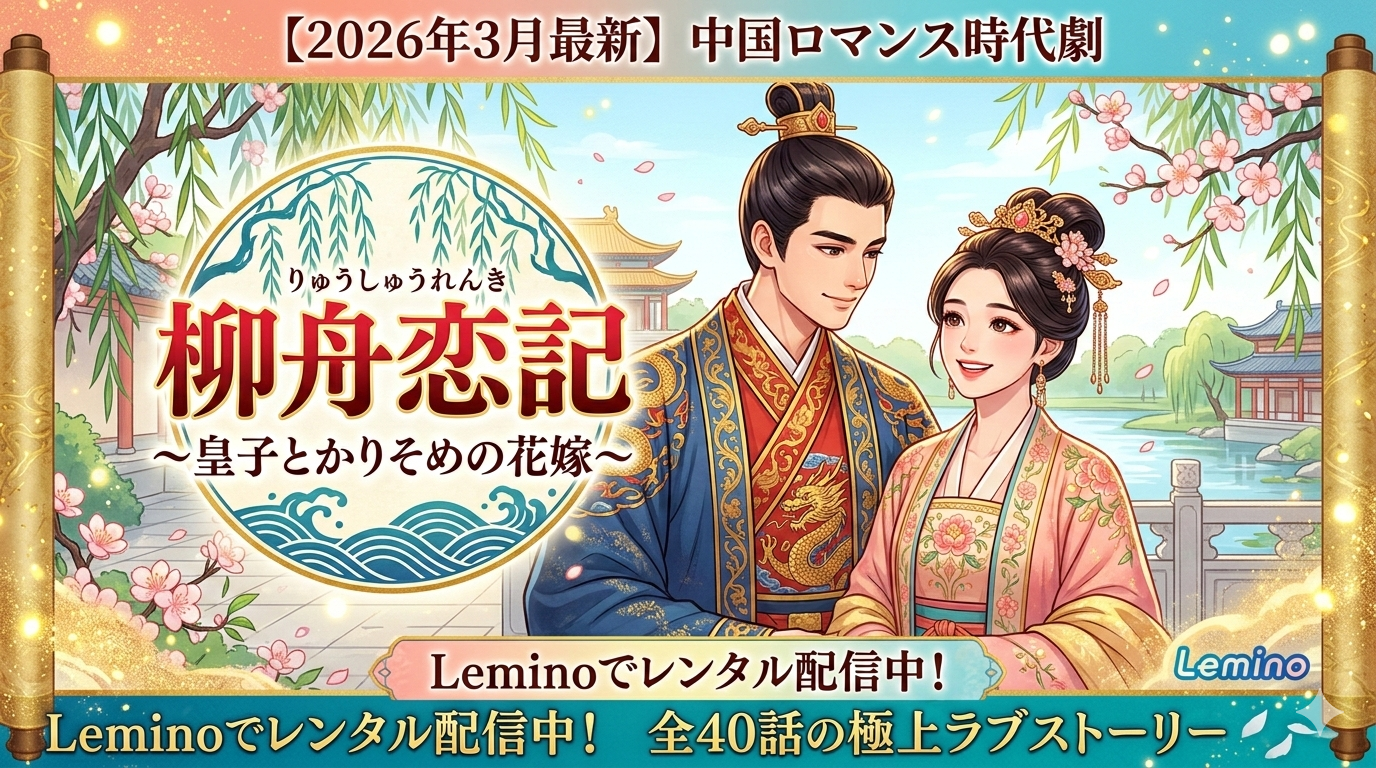 中国ドラマ「柳舟恋記(りゅうしゅうれんき)~皇子とかりそめの花嫁~」は、2026年3月現在Leminoにてレンタル配信中です。ジャン・ワンイーとワン・チューラン主演の極上ロマンス時代劇で、偽りの夫婦生活から芽生える真実の愛に胸が高鳴る全40話の物語。本記事では配信状況・あらすじ・口コミを詳しくまとめました。