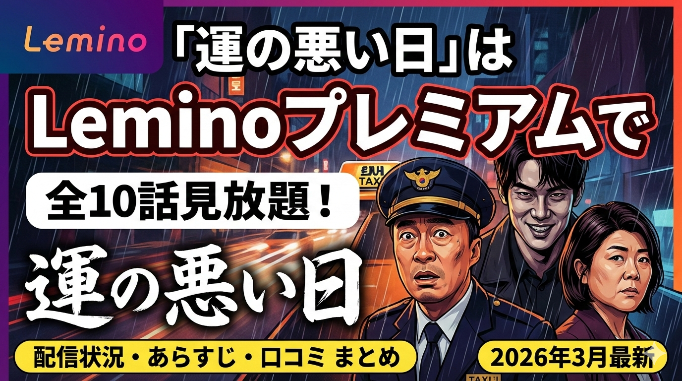 韓国ドラマ「運の悪い日」は、平凡なタクシー運転手が連続殺人犯を乗せてしまったことから始まる衝撃のサスペンス・スリラーです。2026年3月現在、Leminoプレミアムで全10話が見放題配信中です。イ・ソンミン、ユ・ヨンソク、イ・ジョンウンという豪華キャストの鬼気迫る演技が光る本作の魅力を、配信情報・あらすじ・口コミとともに詳しくお伝えします。