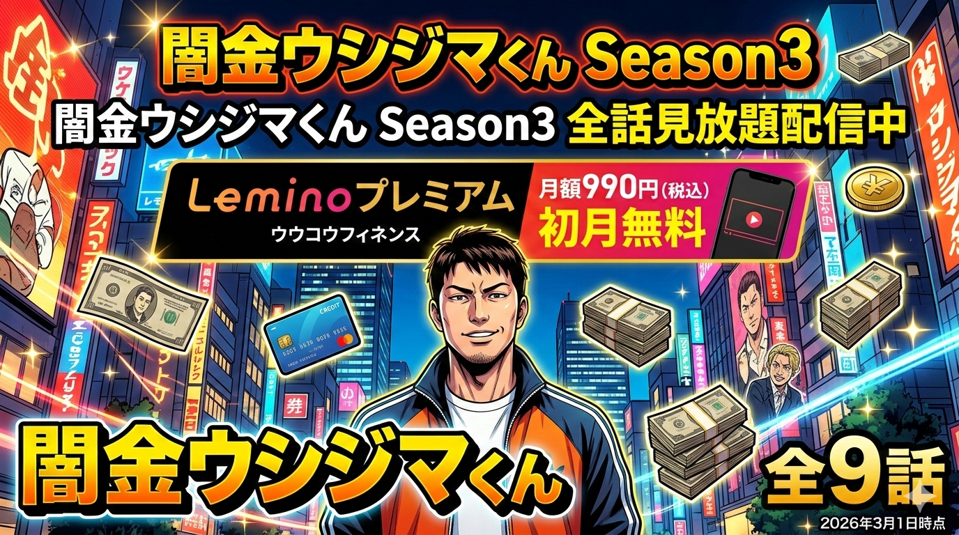 「闘金ウシジマくん Season3」(正式タイトル:闇金ウシジマくん Season3)をお探しの方へ。2026年3月1日時点で、本作はLeminoプレミアムにて全9話が見放題で配信中です。月額990円(税込)で初月無料のため、まだ登録していない方は無料期間中にイッキ見することも可能です。
